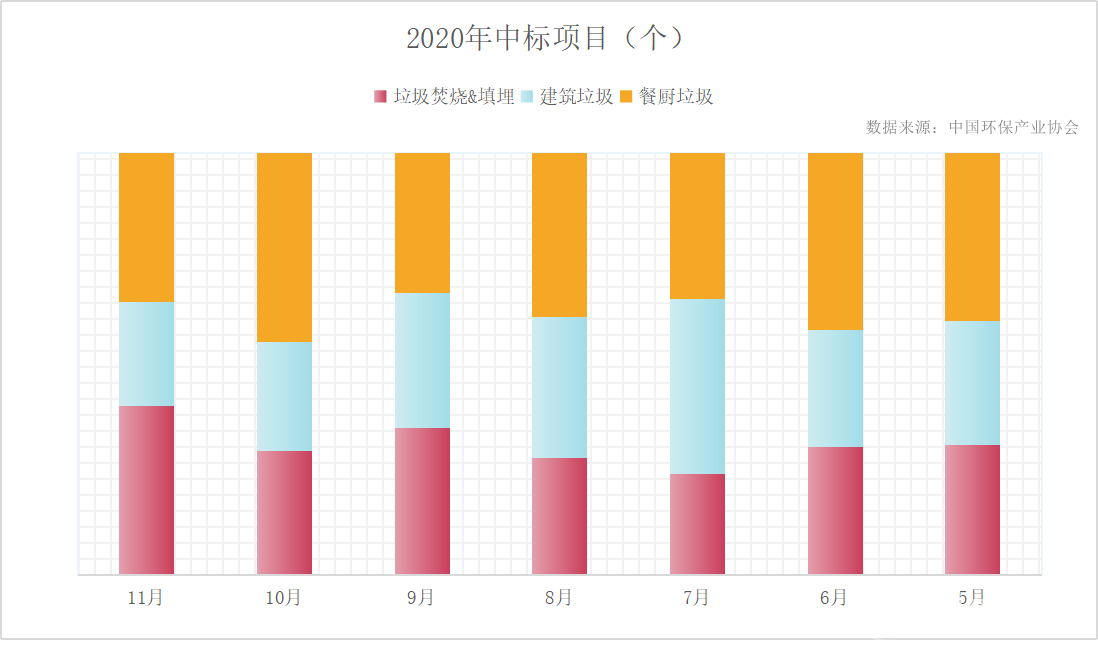 2020年前11个月,全国垃圾焚烧中标项目共计311项,总投资金额共计655.15亿元;餐厨垃圾处理处置中标项目共计361项,总投资金额194.6亿元;2020年5月到11月,全国建筑垃圾处理处置中标项目共计213项,总投资金额61.85亿元。