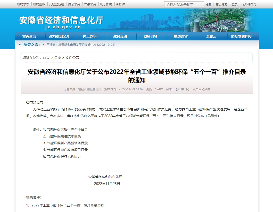 11月29日,安徽省经济和信息化厅公布了2022年全省工业领域节能环保“五个一百”推介目录,678体育科技“抗水耐硫脱硝催化剂制备技术”入选“节能环保先进技术”目录,“防静电聚四氟乙烯覆膜滤料”入选“节能环保新产品新装备”目录。